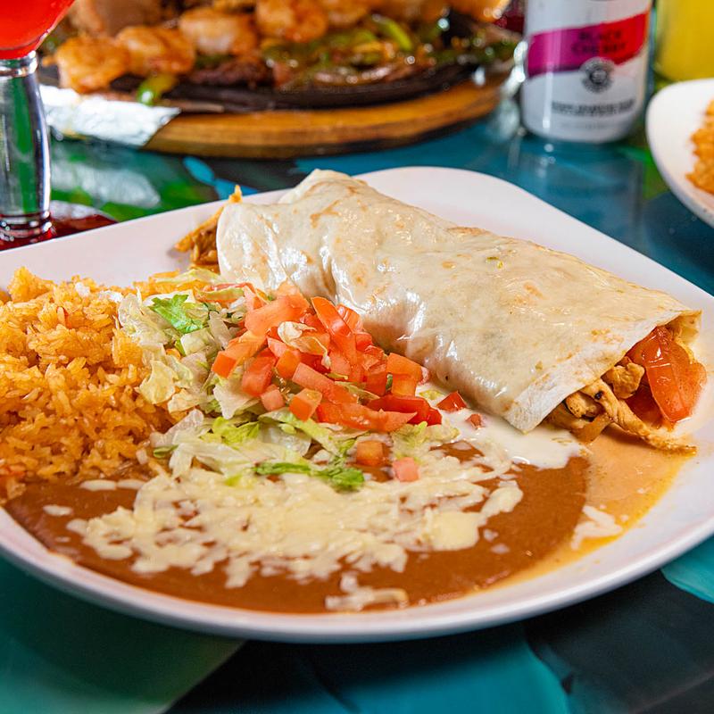 A large flour tortilla filled with seasoned ground beef & shredded chicken. Topped with lettuce, tomatoes, cheese, and sour cream | Served with rice & beans.