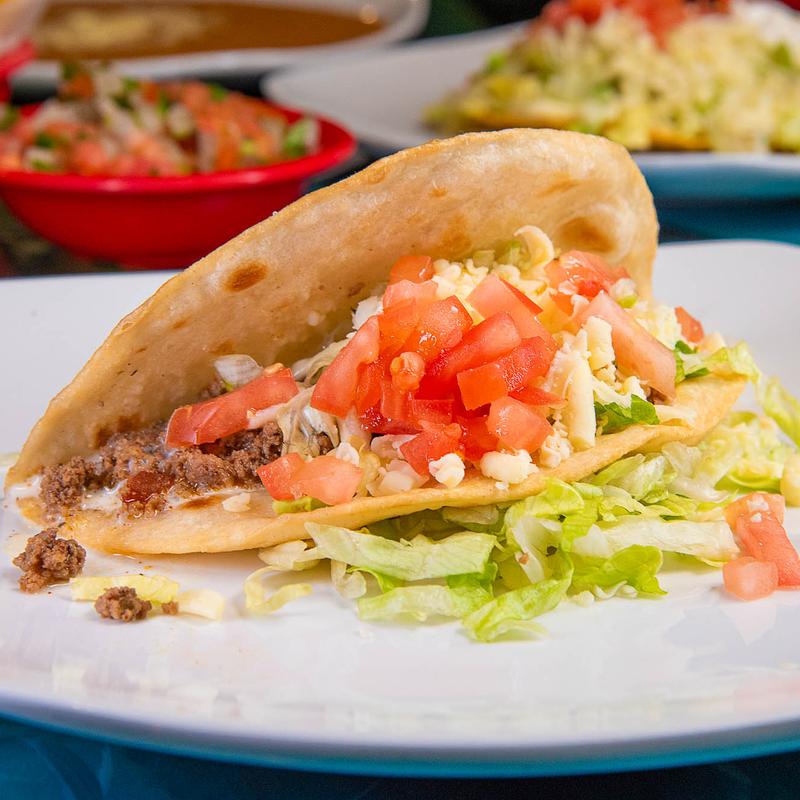Two flat crispy corn tortillas covered with Ground Beef or Shredded Chicken. Topped with cheese, lettuce, diced tomatoes, and sour cream.
