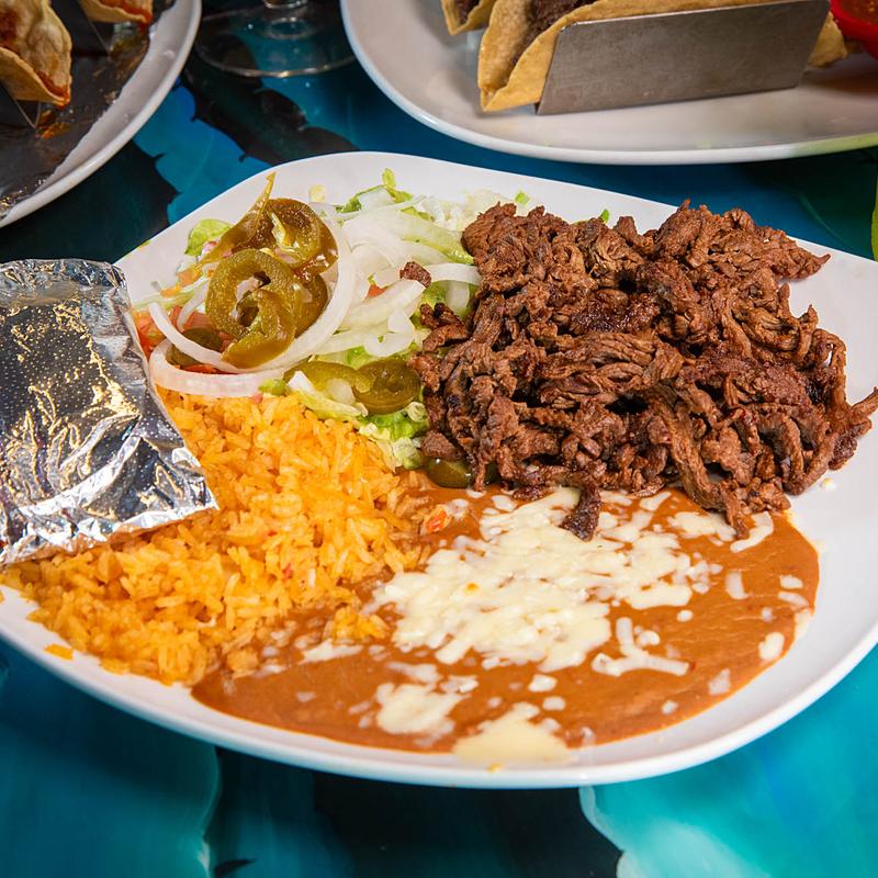 Grilled strips of Steak or Chicken breast simmered in chile rojo sauce | Served with Mexican rice, refried beans, and Corn or Flour tortillas.